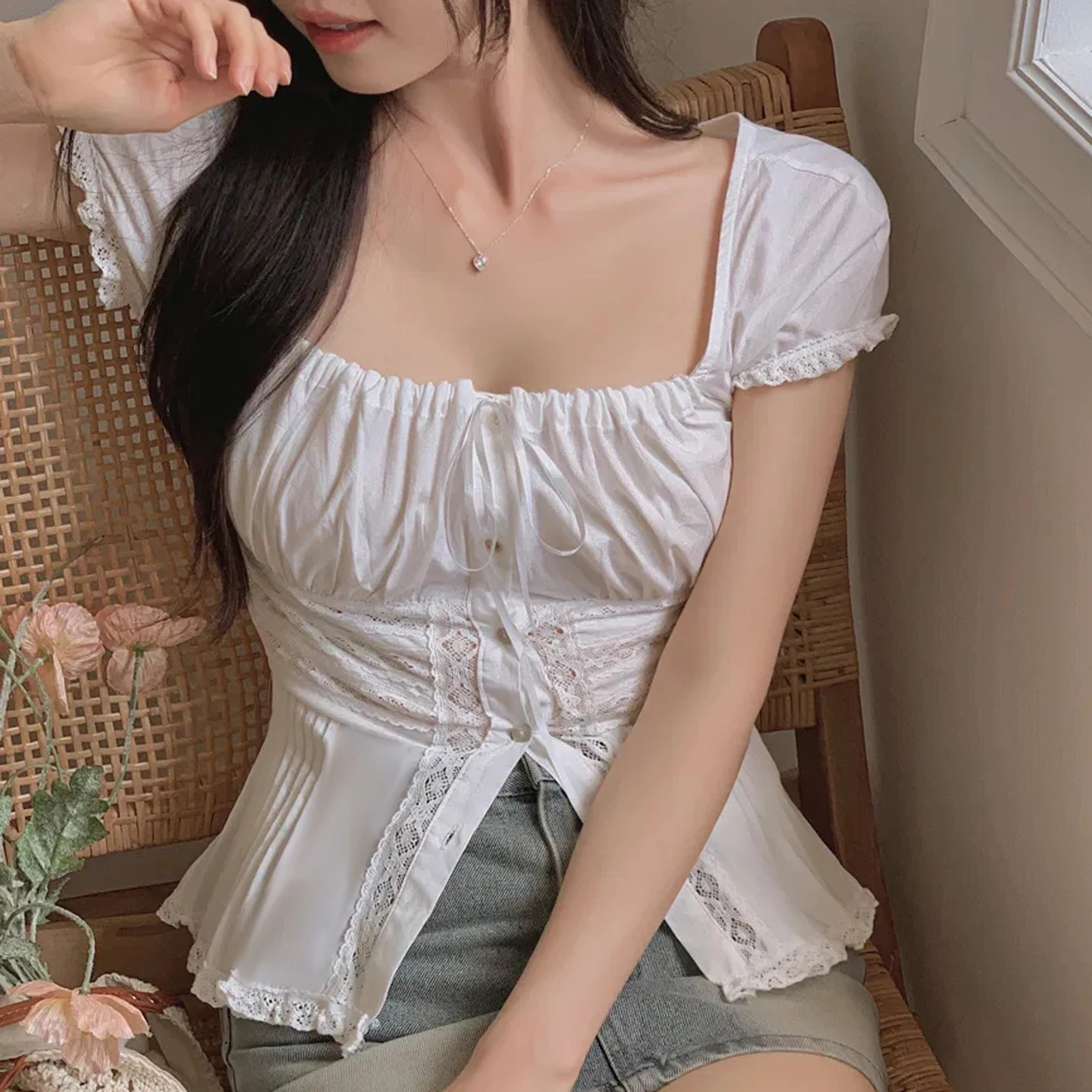 Women's White Square Neck Puff Sleeve Blouse with Lace Trim and Drawstring Tie Design Flared Hem Party Wear Wholesale Supplier